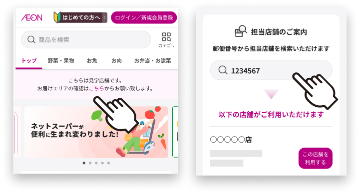 ※なお、お届け先住所の担当店舗は、ウェブサイトトップ画面の「担当店舗のご案内」より、郵便番号で検索することができます。